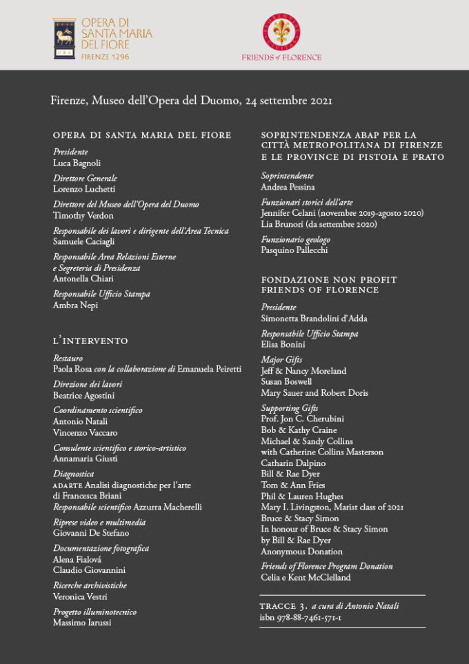 I testi di Timothy Verdon, direttore del Museo, Antonio Natali e Paola Rosa, aiutano a comprendere le vicende storiche del capolavoro michelangiolesco, il suo valore artistico e l’intervento conservativo che su di esso è stato eseguito.
