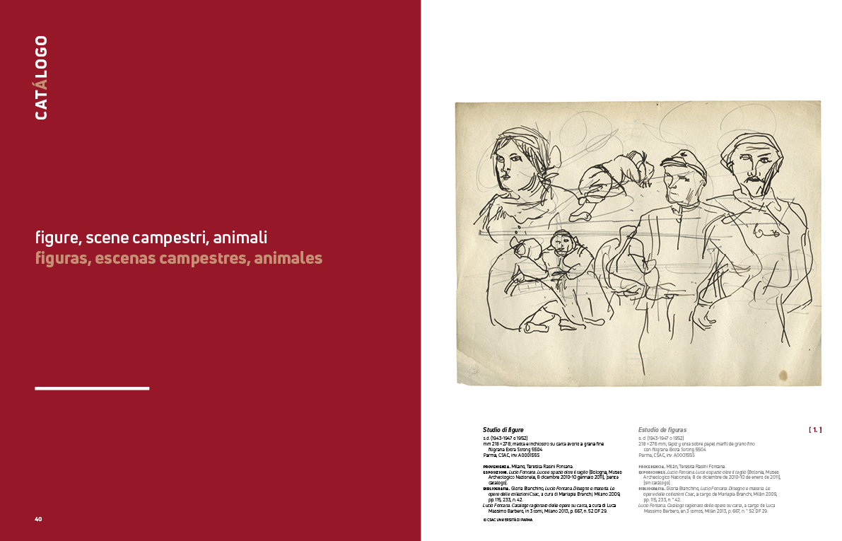 Il catalogo racconta suggestivamente la mostra argentina, dove saranno esposti sessantaquattro disegni di Lucio Fontana (più due sculture e un “concetto spaziale”), tutti provenienti da un lascito che Teresita, sua moglie, fece nel 1988 al CSAC (Centro Studi e Archivio della Comunicazione) dell’Università di Parma, e selezionati secondo un preciso criterio filologico. I disegni, circoscritti in un arco spazio-temporale di circa un ventennio (1938-1959), rappresentano la più alta testimonianza della produzione grafica dell’artista, in particolare di quella del suo secondo soggiorno argentino, che va dal 1940 al 1947. Si tratta di un corpus specifico di matite e di inchiostri su carta che rappresentano una fase cruciale del suo percorso artistico e precedono la successiva e meglio nota stagione, quella che dalla pubblicazione del Manifiesto Blanco2 (1946) arriva all’invenzione dei “buchi”, dei “concetti spaziali” e infine dei più celebri “tagli”.