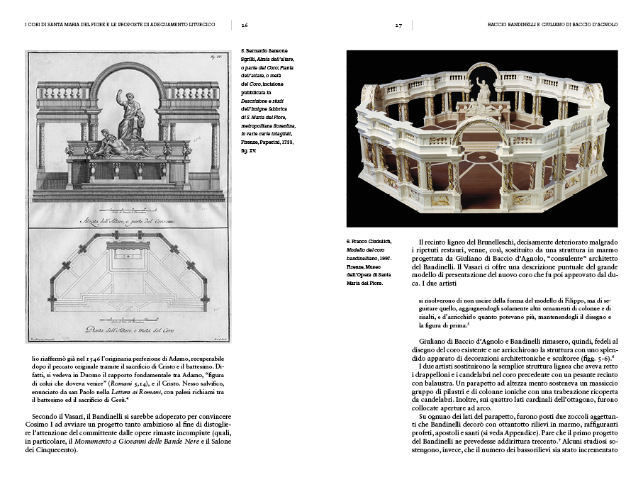 L’opportunità di una tesi specifica qui riassunta e integrata ci è parsa interessante e perfettamente congruente con il taglio di questi Quaderni. Così, questo impegno di Antonio Lattuchella, introdotto dai suoi relatori, ben riassume l’intera vicenda, dalla prima delimitazione dell’area presbiteriale (1380) fino alle ultime proposte – ad oggi inedite – del Sabatini, del Morozzi e del Bartoli: tutti tentativi degnissimi (e non facili) di conciliare il divenire delle funzioni liturgiche col rispetto per l’architettura e la sua ineludibile funzionalità. Ne scaturisce un racconto complesso e singolare, parallelo ai mutamenti culturali e stilistici, ove il focus del problema ruota sempre intorno a quell’impronta ottagonale (che non poteva non echeggiare l’imperativa geometria della sovrastante cupola) che, più di altri, modellò Baccio Bandinelli e che Gaetano Baccani, tre secoli dopo, smontò programmaticamente, dando il via alla diaspora dei non pochi “marmi”.