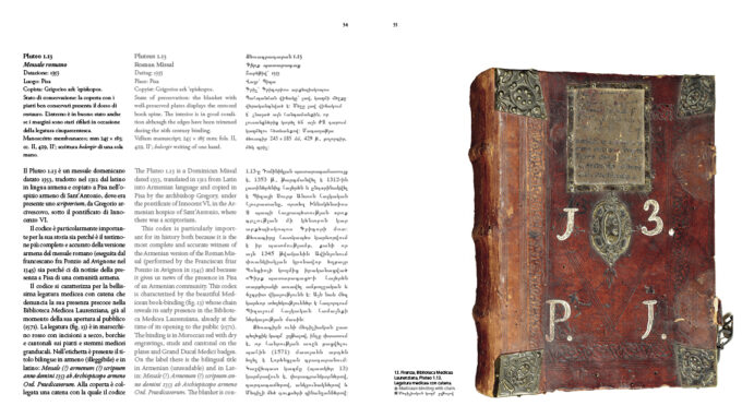 CataloghiIl catalogo in tre lingue (italiano, inglese, armeno) della mostra Tre manoscritti armeni dalla Toscana (XIII-XIV secolo) illustra accuratamente un’esposizione programmata per la durata di sette mesi, dal 9 giugno prossimo al 9 gennaio del 2020. La mostra si terrà al museo Matenadaran di Jerevan, in Armenia, e si incentrerà su tre preziosi manoscritti armeni risalenti al XIII e XIV secolo provenienti dalla Biblioteca Medicea Laurenziana. Il catalogo racconta la genesi e le vicissitudini storiche dei tre manoscritti, insistendo sulla loro importanza nella misura in cui testimoniano i profondi e vivaci legami che sempre sussistettero tra Italia e Armenia, oltre che il ruolo fecondo delle comunità armene in Toscana e nella Penisola. Il progetto di allestimento della mostra si è avvalso del supporto dei ricercatori del Consiglio Nazionale delle Ricerche (CNR), i quali hanno reso fruibili testi e immagini attraverso la loro descrizione multimediale e interattiva. Il catalogo, impreziosito da illustrazioni accurate, a cura di Anna Rita Fantoni e Giovanna Rasario, è introdotto dalle prefazioni dell’ambasciatore d’Italia Vincenzo Del Monaco e del presidente del Consiglio Nazionale delle Ricerche Massimo Inguscio.
